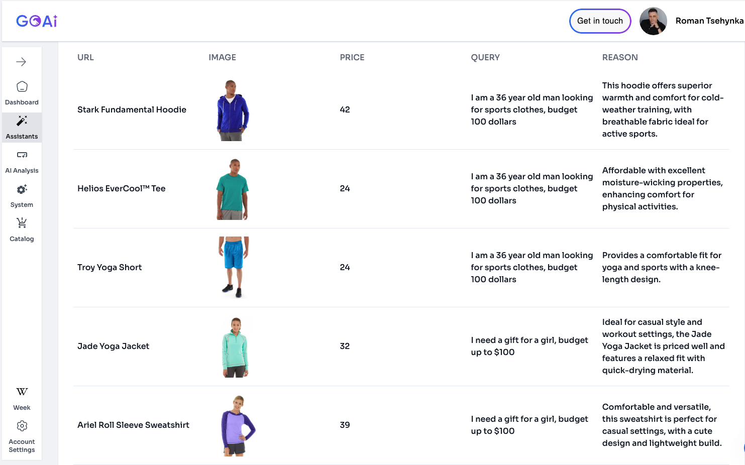 Last 10 product recommendations (with query context and timestamp)
