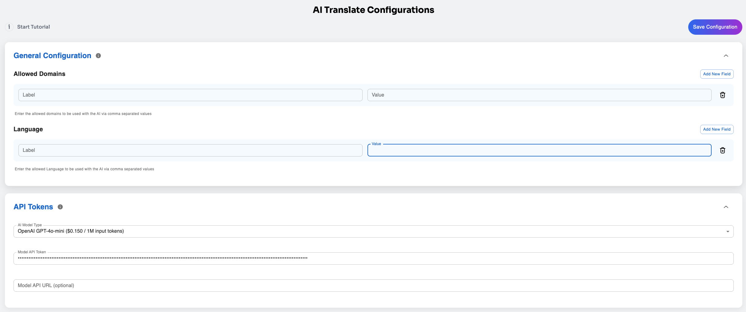The AI Translate Configurations page allows administrators to manage plugin settings and integration parameters. The configuration is divided into sections, each containing fields for customization.